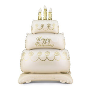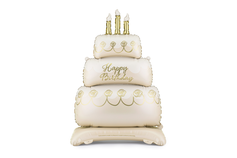 Pastatomas folijos balionas „Tortas“, smėlio ir auksinės spalvos. Dydis prieš pripūtimą: maždaug 76,5 x 144 cm (30,1 x 56,7 colio), po pripūtimo: maždaug 70 x 100 cm (27,6 x 39,4 colio). Skirtas tik pripūsti oru. Rinkinyje yra šiaudelis.