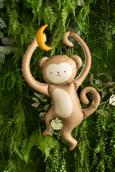Folinis balionas „Beždžionė“, smėlio ir kreminės spalvų. Dydis prieš pripūtimą: apie 67,5 x 99 cm (26,6 x 39”), po pripūtimo: apie 51 x 88 cm (20,1 x 34,6”). Skirtas tik pripūsti oru. Rinkinyje yra šiaudelis.