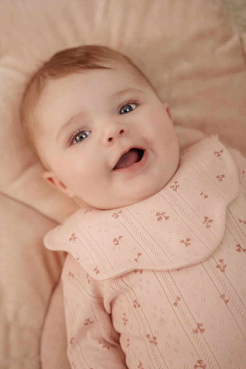 Pasinerkite į svajonių pasaulį su šiuo žavingu ilgarankoviu romperiu! Pagamintas iš minkštos ekologiškos medvilnės, jis derina patogumą ir gražų dizainą. Rafinuota audinio struktūra, mielo šviesiai rožinio atspalvio, papuošta žavingu smulkių gėlyčių raštu. Raukšlės palei iškirptę suteikia papildomo žavesio. Praktiškas spaudės užsegimas ties tarpkoju leidžia lengvai persirengti. Romperis lengvai derinamas su bet kuriuo drabužiu iš derančios „Fairy Garden“ kolekcijos.