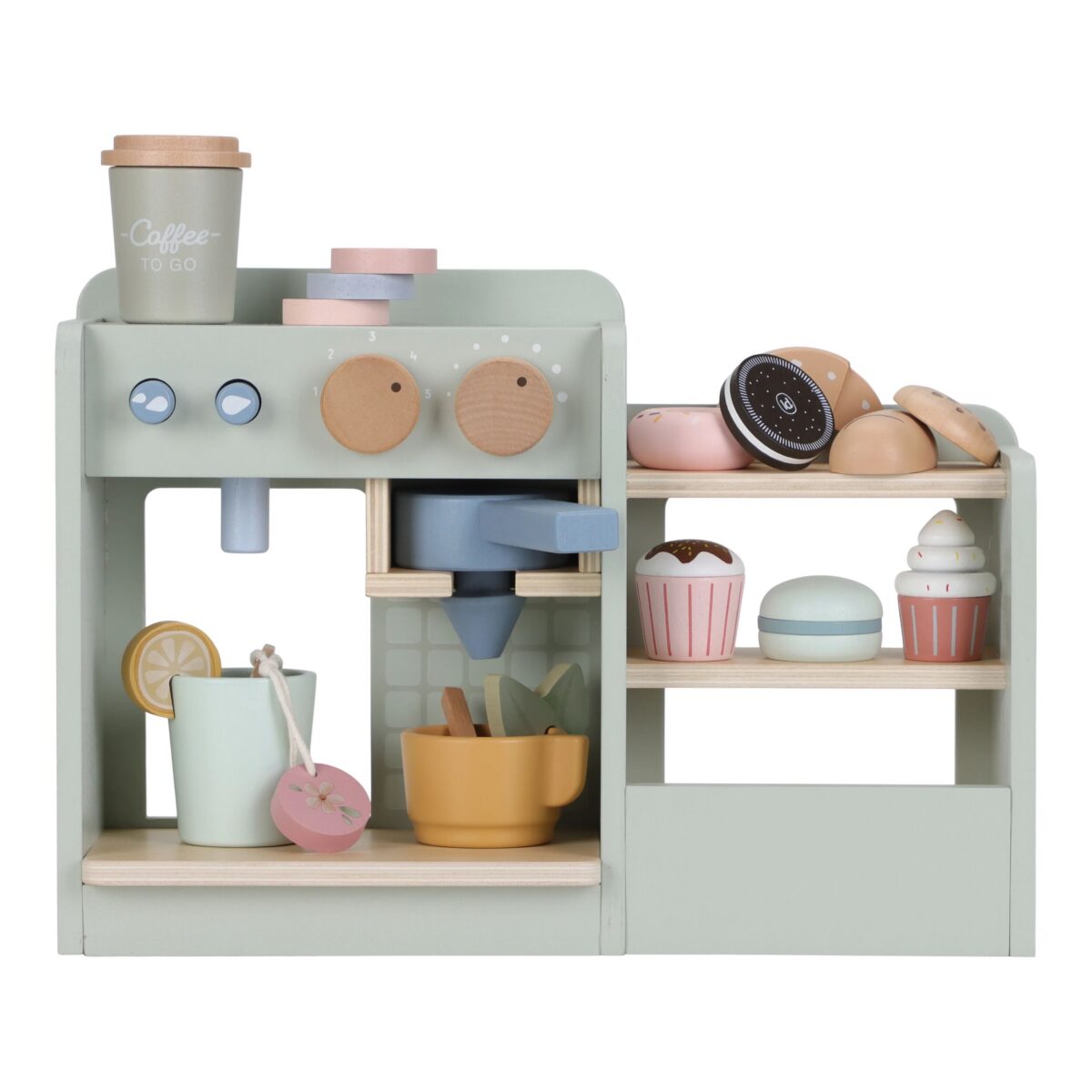 Sveiki atvykę į jaukiausią kavos kampelį! Patiekite gardų puodelį kavos ar arbatos su šviežiu sumuštiniu ar pyragaičiu. Su šiuo gražiu žaisliniu kavos kampeliu jūsų mažylis galės spaudinėti mygtukus, pasirinkti tinkamą nustatymą ir padėti kavos pagalvėlę, kad pasijustų kaip barista. Rinkinį sudaro kavos ir arbatos aparatas, puodelių laikymo vieta ir spintelė visiems skaniems skanėstams eksponuoti. Kas ateis užsisakyti ko nors skanaus?