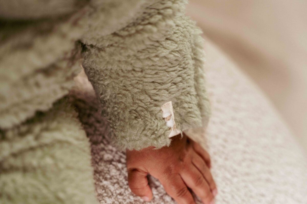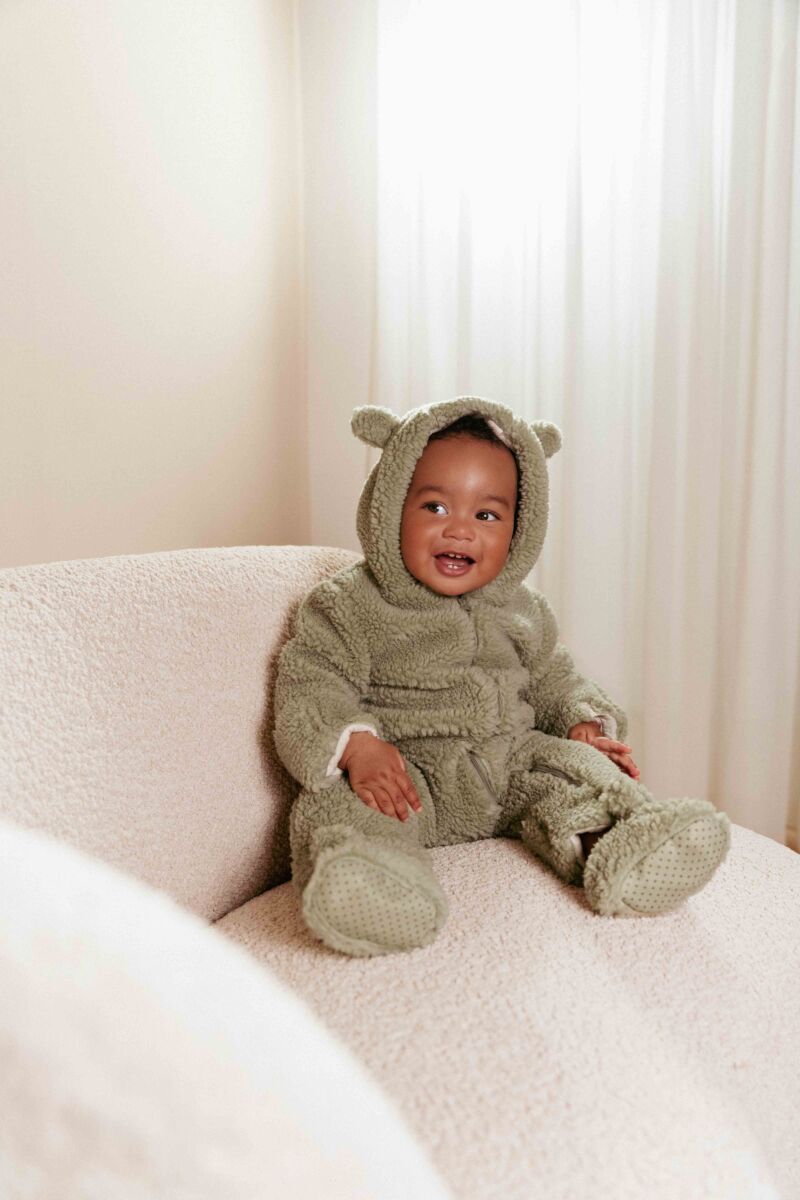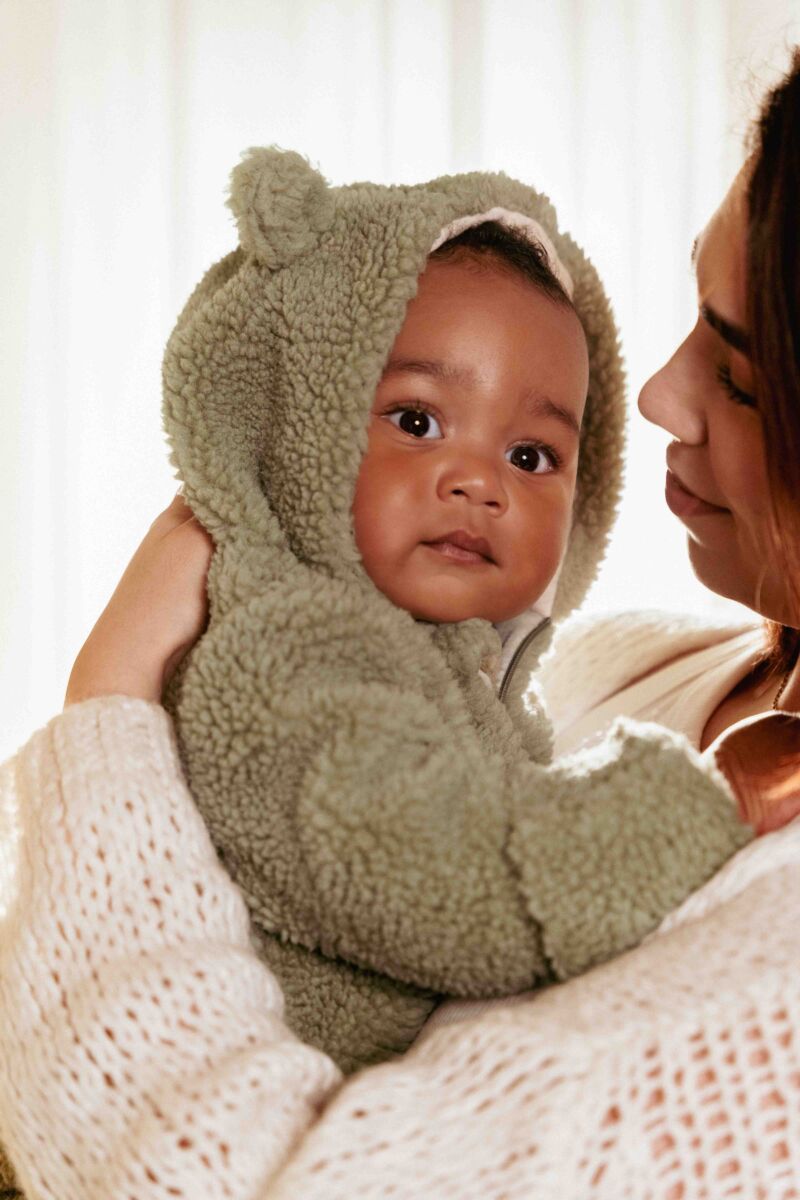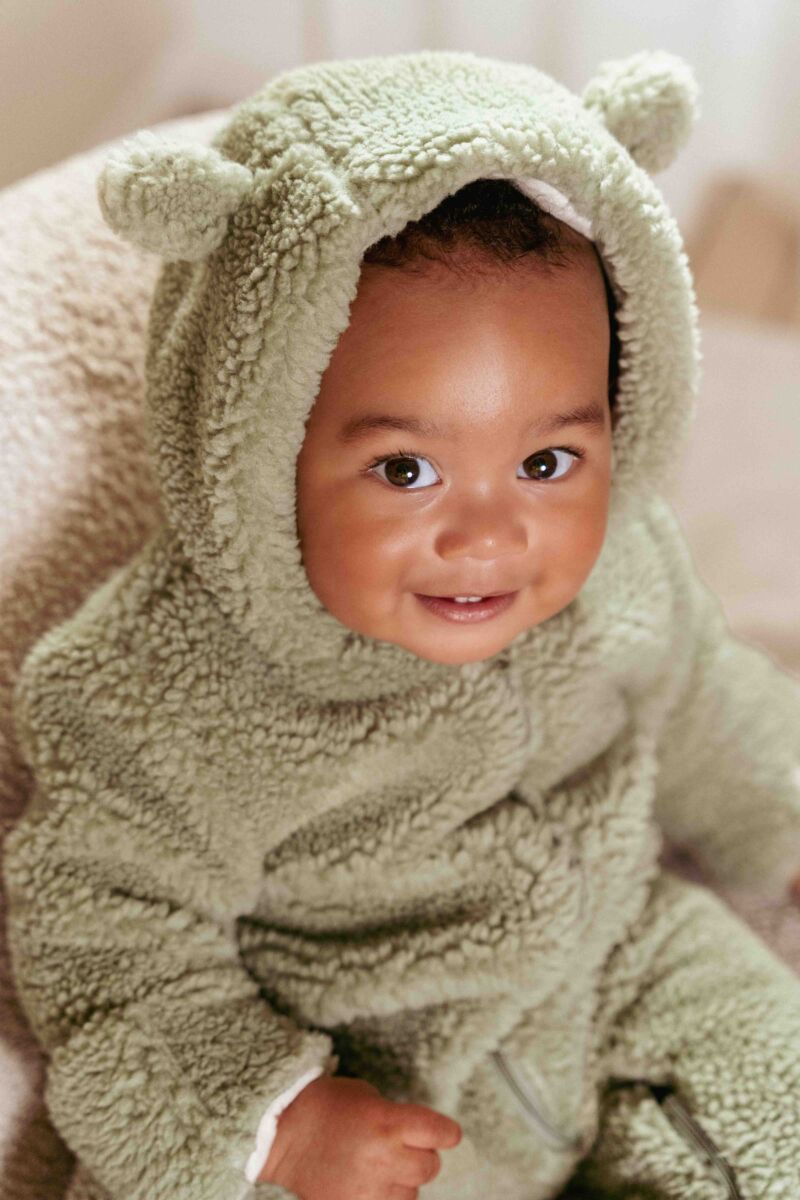 Šis smėlio spalvos vientisas kombinezonas sukurtas siekiant maksimalaus patogumo ir mielumo. Pagaminta iš minkštos ir šiltos meškiuko medžiagos, ji jaukiai apkabins jūsų mažylį. Kostiumas pasižymi švelniu ekologiškos medvilnės pamušalu, puoštu žavingu raštu, užtikrinančiu komfortą ir stilių. Patogus priekinis užtrauktukas, todėl apsirengimas yra be rūpesčių. Ant gobtuvo yra mielos zuikio ausytės, kurios suteikia papildomo žavesio. Atlenkiami rankogaliai prie rankovių ir kojų suteikia papildomos šilumos ir patogumo, puikiai tinka vėsiomis dienomis.
