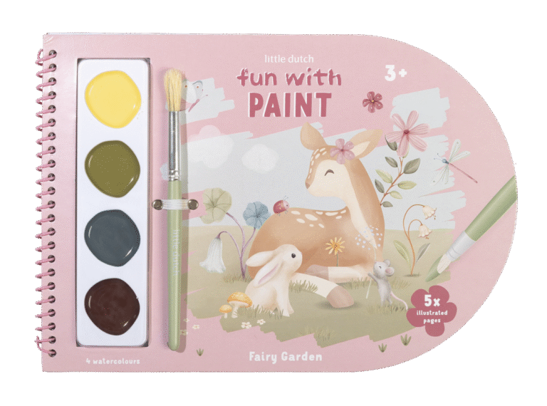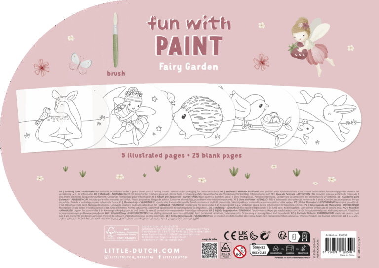 Knygelėje yra teptukas ir keturi akvareliniai dažai, tad vaikai gali pradėti iš karto. Nesvarbu, ar jie nori nuspalvinti fėją, ar nupiešti savo gėlių pievą, kiekvienas puslapis siūlo naują kūrybinę akimirką. Tvirtas popierius leidžia lengvai ir smagiai piešti mažoms rankytėms.