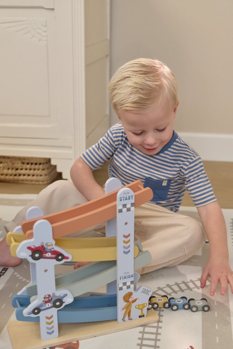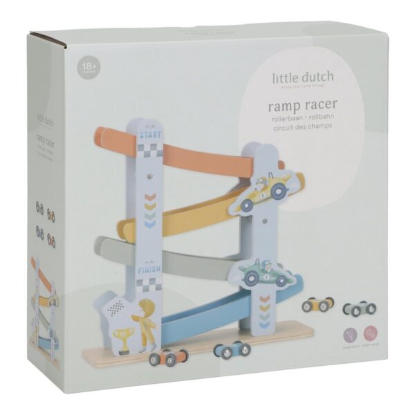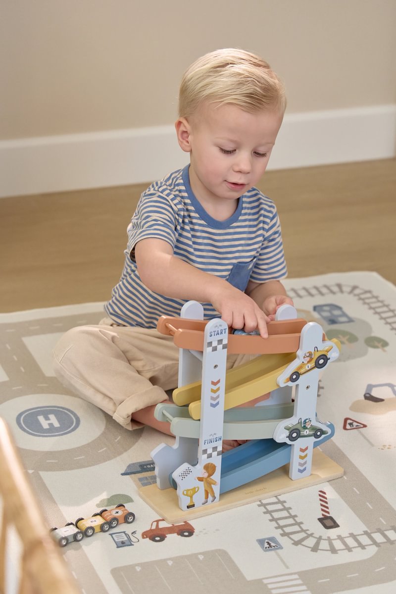trasa. Linksmos spalvos ir šauni lenktynių tema kiekvieną važiavimą paverčia švente. Puikiai tinka žaisti kartu ir lavinti vaizduotę. Pagaminta iš tvirtos medienos ir puikiai derinama su kitomis „Little Dutch“ transporto priemonėmis.