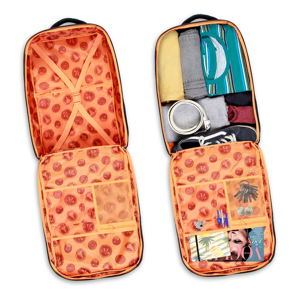 Lengva, vandeniui atspari rankinė kuprinė, tinkanti daugumai oro linijų ir laikyti po sėdyne. Trys skyriai su 180° atsidarymu ir spausdintu pamušalu. Vidinės kišenės ir pečių diržas. Atskiras skyrius nešiojamajam kompiuteriui iki 15 colių įstrižainės planšetiniam kompiuteriui ir asmeniniams daiktams. Vandeniui atspari priekinė kišenė, šoninė butelio kišenė ir nugaros dirželis tvirtinimui prie lagamino. Sustiprinti dirželiai, reguliuojami krūtinės ir šoniniai dirželiai.