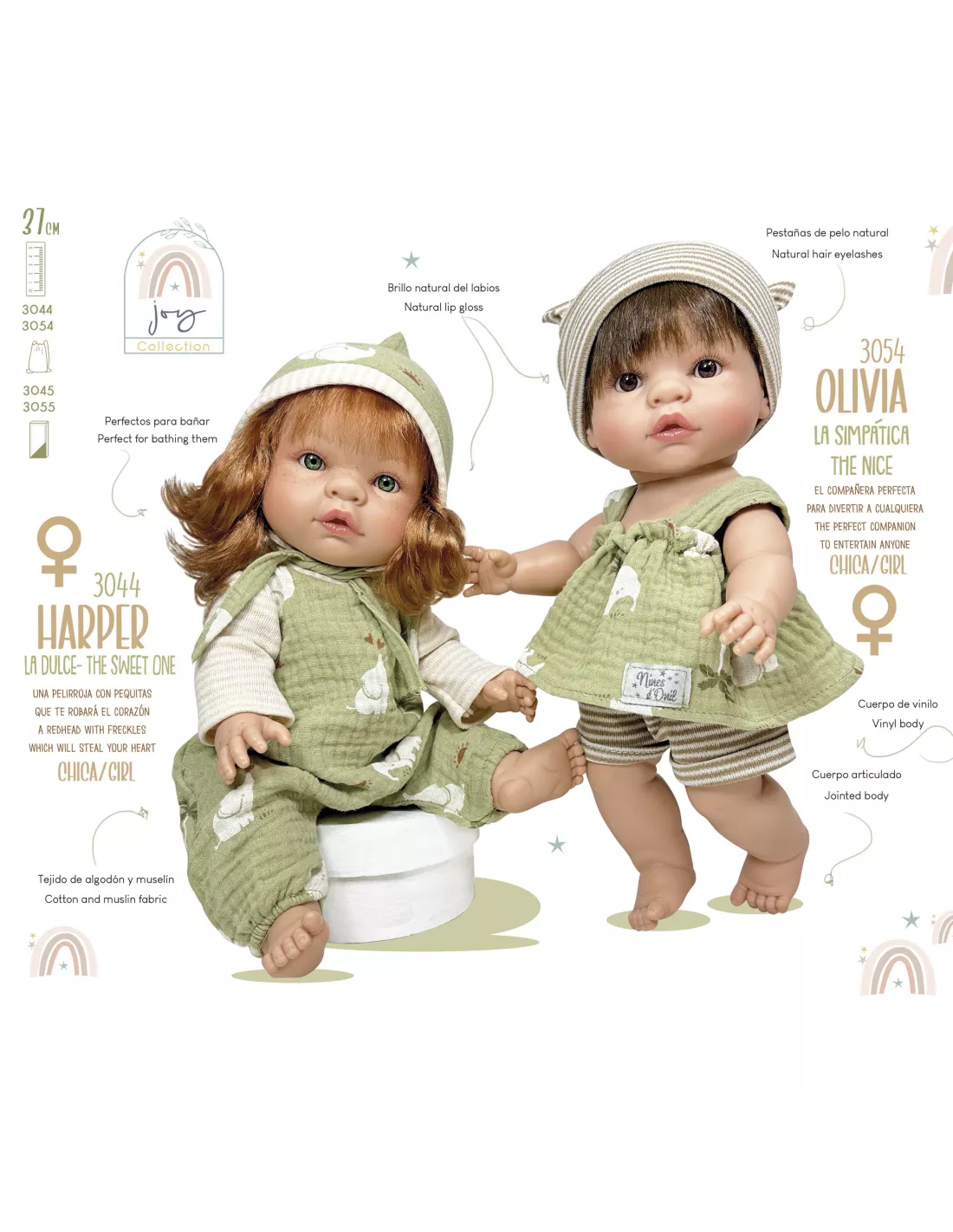 Susipažinkite su Olivia – gražia ir tikroviška lėle iš „Nines d’Onil“ „Joy“ kolekcijos! 37 cm  dydžio Olivia pagaminta iš aukštos kokybės vinilo, todėl ji yra ne tik patvari, bet ir saugi maudytis.