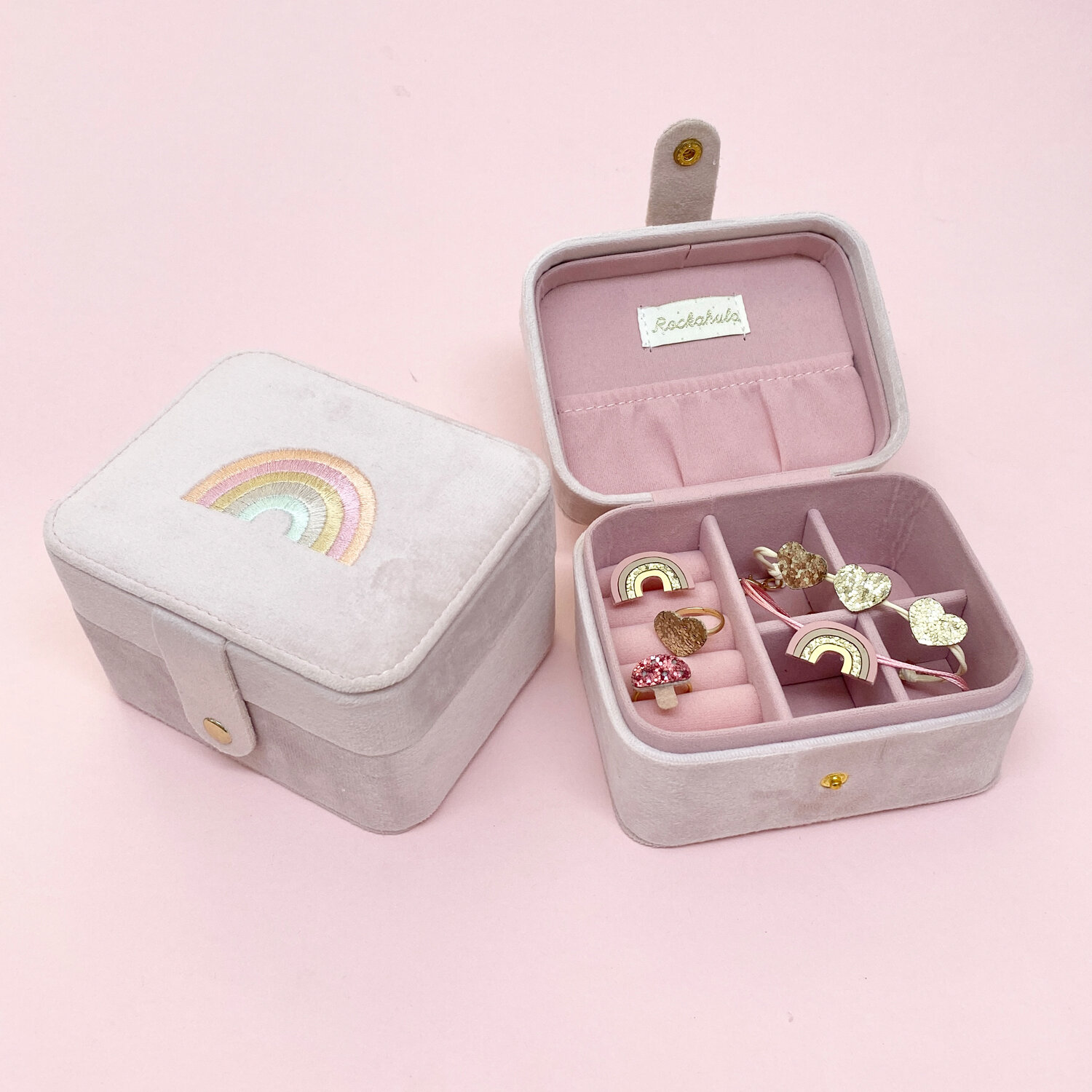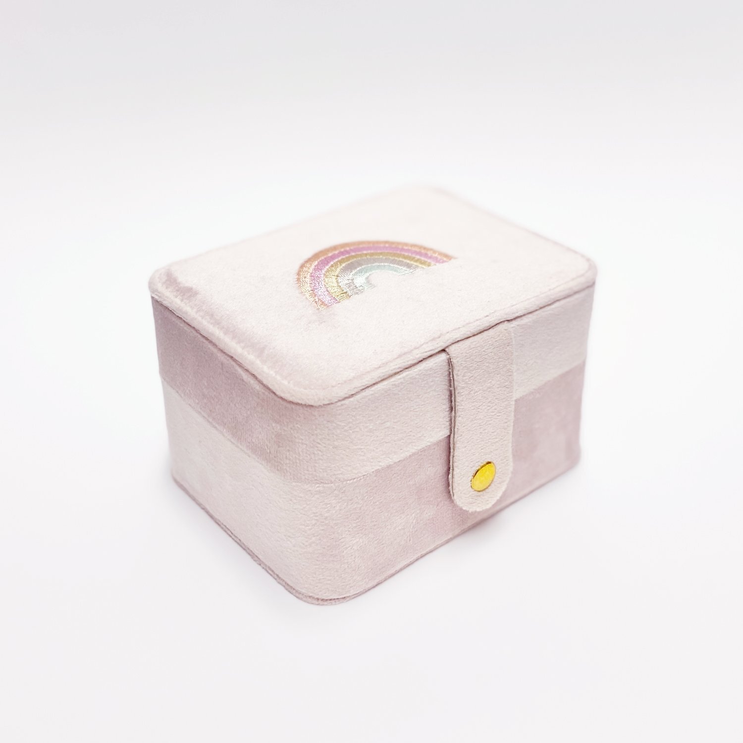 Nuostabi, itin minkšto aksominio papuošalų dėžutė – puiki vieta saugiai laikyti visus jūsų „Rockahula“ papuošalus ir mėgstamiausius lobius! Ši papuošalų dėžutė, kurios viršuje yra graži siuvinėta vaivorykštė, užsegama spaudėmis, atskleidžiančiomis keturis skyrius, kišenėlę ir specialią vietą auskarams bei žiedams. Matmenys: plotis 12 cm x aukštis 7,5 cm x gylis 10 cm. Netinka vaikams iki 36 mėnesių dėl smulkių detalių.
