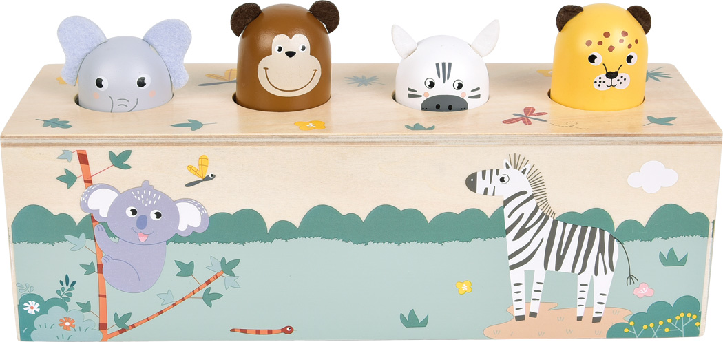 Aukštos kokybės mygtukas spaudžiant kviečia vaikus stebėtis, klausytis ir atrasti. Keturios detalios gyvūnų galvos – dramblys, beždžionė, zebras ir leopardas – stebina autentiškais gyvūnų garsais, švelniai paspaudus. Linksmi judesiai ir garsai skatina dėmesį ir pakartotinį žaidimą. Tvirta medinė konstrukcija su vaikams pritaikytomis safario stiliaus iliustracijomis žavi modernia spalvų gama ir patvaria kokybe. Žaismingas smulkiosios motorikos, klausymosi įgūdžių ir santykių supratimo lavinimas, todėl idealiai tinka smalsiems vaikams!