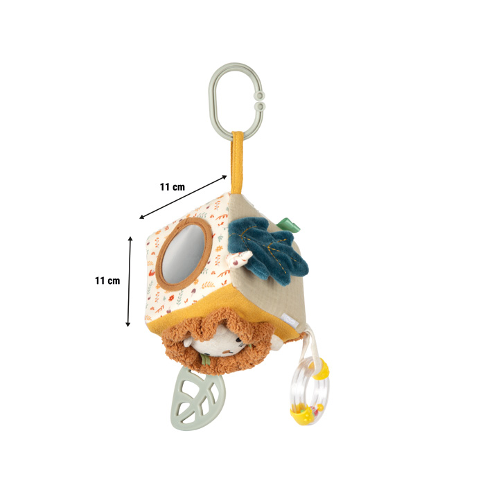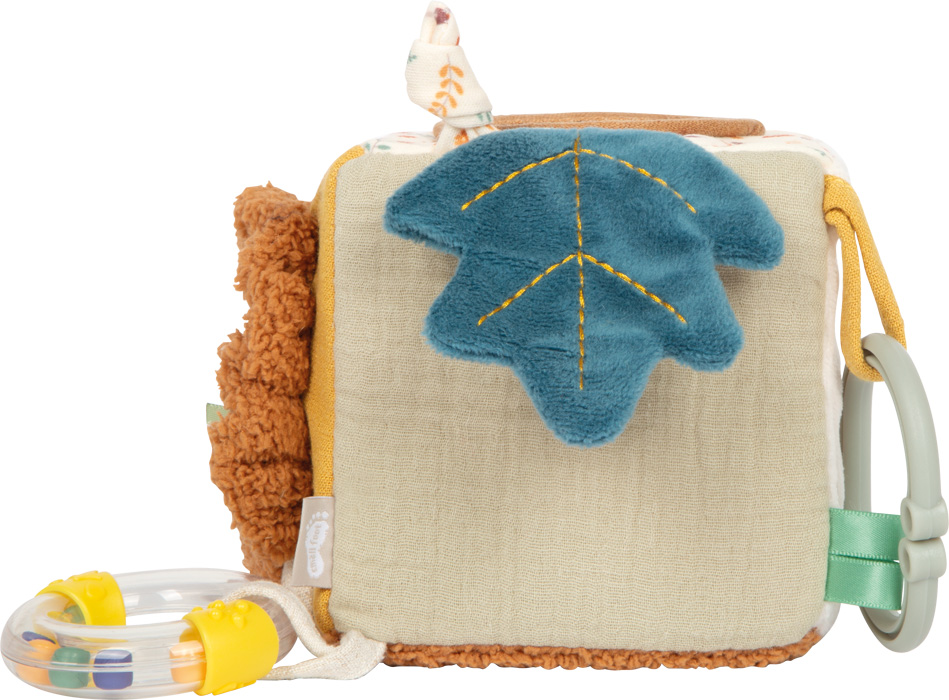Palieskite, klausykite ir atraskite! Šis minkštas kubelis yra universalus kūdikių žaislas, kuris skatina žaisti ir atrasti, turėdamas keletą įdomių funkcijų. Čia čežantys elementai, mažas integruotas varpelis, barškutis ir kramtukas suteikia įvairių stimulų, žaismingai palaikydami ankstyvąjį vaiko vystymąsi. Skirtingos audinio struktūros skatina lietimą, o tikslingas kubelio šonų suėmimas, spaudimas ir sukimas lavina smulkiąją motoriką. Dėl praktiškos kilpelės jį galima lengvai pritvirtinti prie vežimėlio, kūdikio nešioklės ar žaislų stovo – ir jis visada yra šalia.