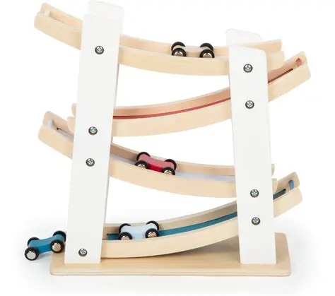 Ši medinė lenktynių trasa su tvirtu pagrindu užtikrina greitą veikimą, kai keturi maži mediniai žaisliniai automobiliai užtraukia rampomis žemyn. Keliaudami nuo grindų iki grindų, žaisliniai automobiliai atlieka linksmus salto ir atneša daug linksmybių. Balta spalva nudažyta natūralios medienos dalimis kartu su klasikine rampų spalvų gama, ši lenktynių trasa yra tikra akį traukianti priemonė, kuri puikiai tinka kiekviename darželyje. Skatina motorinių įgūdžių lavinimą, taip pat rankų ir akių koordinaciją, užkertant kelią nuoboduliui darželyje! Lenktynių trasa, laikoma vaikų kambario lentynoje, puikiai dera prie kiekvieno kambario dizaino, nes natūrali mediena ir balta dažyta mediena yra dominuojančios optinės savybės.