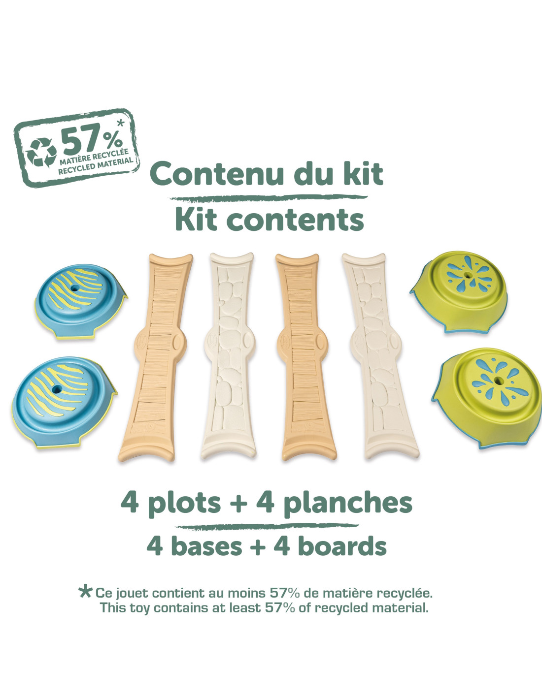 Rinkinį sudaro keturios ilgos (70 cm) panelės su skirtingomis tekstūromis ir keturi pagrindai joms pritvirtinti. Lanksti elementų konfigūracija leidžia sukurti iki 3,5 metro ilgio taką, pritaikytą jūsų vaiko gebėjimams. Rekomenduojama taku vaikščioti basomis, nes tai pagerina sensorinę patirtį ir teigiamai veikia nervų sistemos vystymąsi.